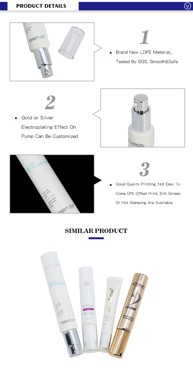 Now you can see this plastic press tube, it is with airless pump . Small tube body ,can be applicated for facial lotion moisturizer,facial serum or other ointment and so on.
